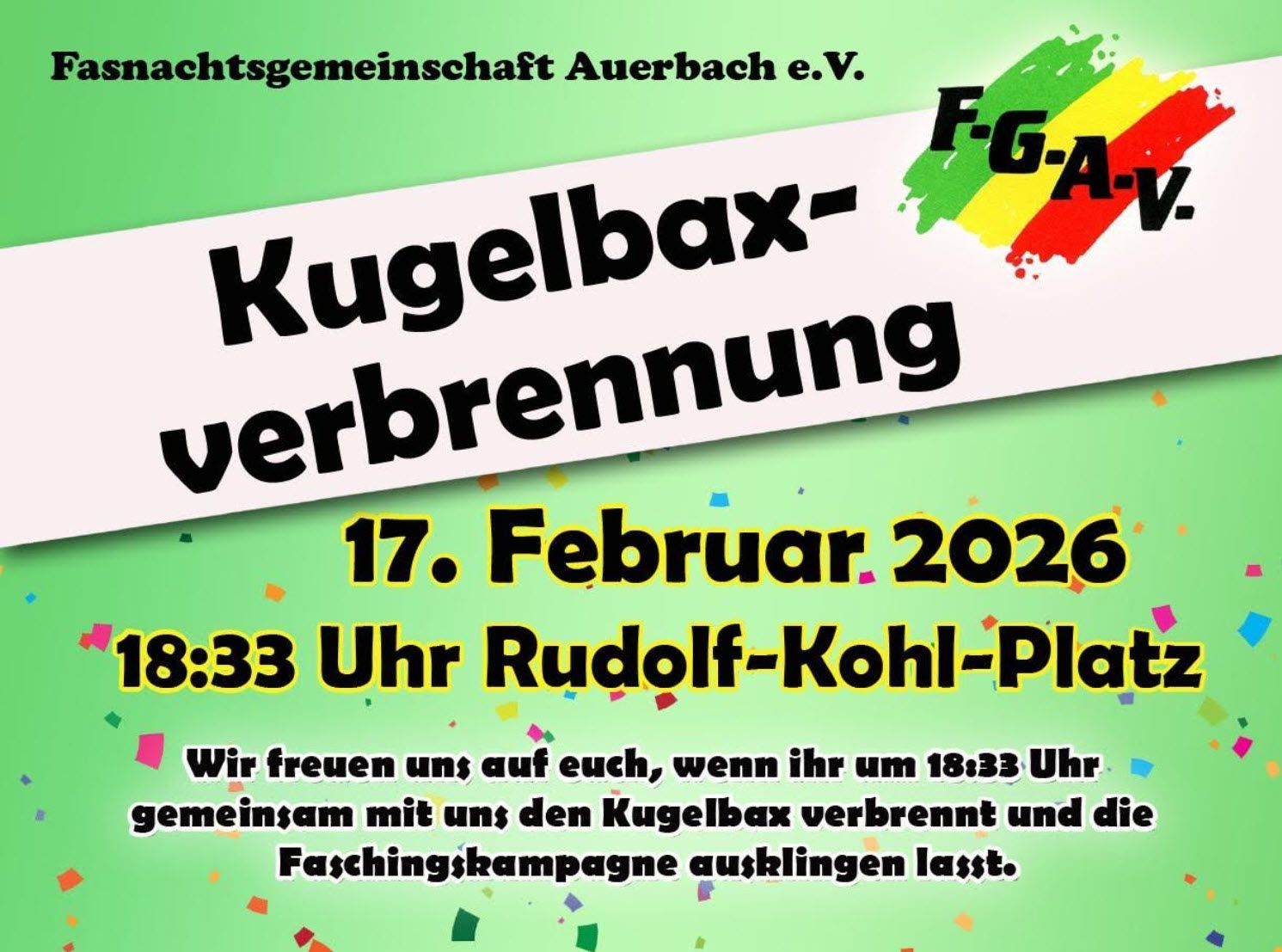 Am Faschingsdienstag feiern wir das Ende der Kampagne. Um 18.33 Uhr steht der "Kugelbax" auf dem Rudolf-Kohl-Platz in Flammen - damit werden die letzten Stunden der närrischen Zeit eingeläutet. Diese feiern wir anschließend mit unseren Aktiven und Freunden der FGAV im "Schlössle" in Auerbach und freuen uns auf viele Gäste!
